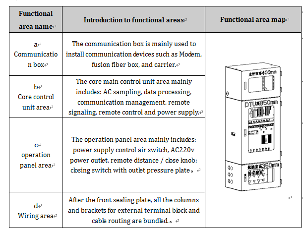 يتم تقسيم محطة توزيع الطاقة إلى منطقة وحدة القياس والتحكم الأساسية ، ومنطقة لوحة التشغيل ومنطقة محطة الأسلاك وفقًا للوظائف ، وتم بناء منطقة لوحة التشغيل الداخلية في البطارية. إذا كنت بحاجة إلى تثبيت معدات الاتصالات مثل صندوق المصهر والناقل ، فيمكن تزويد محطة توزيع الطاقة بصندوق اتصال. المنطقة الوظيفية مقسمة كما هو موضح في الجدول أدناه ..